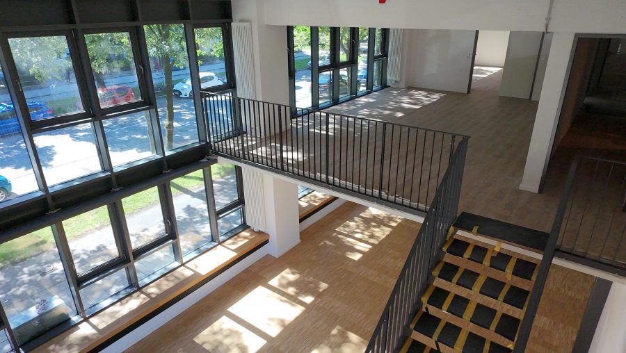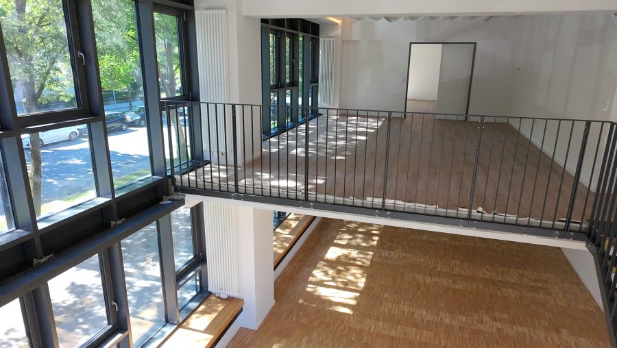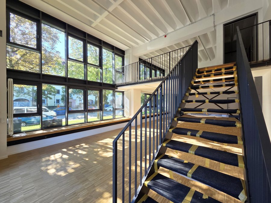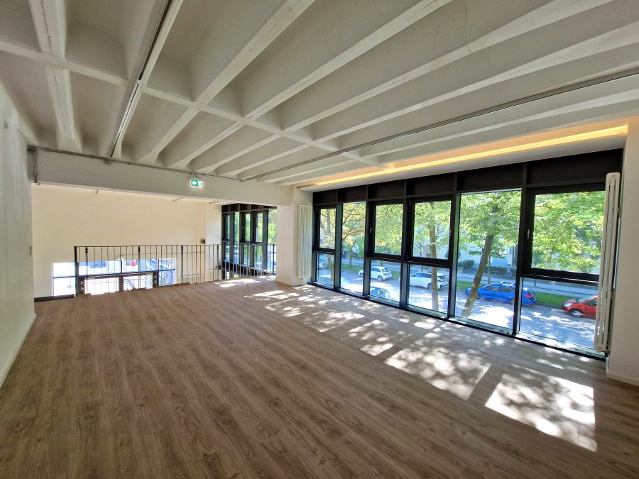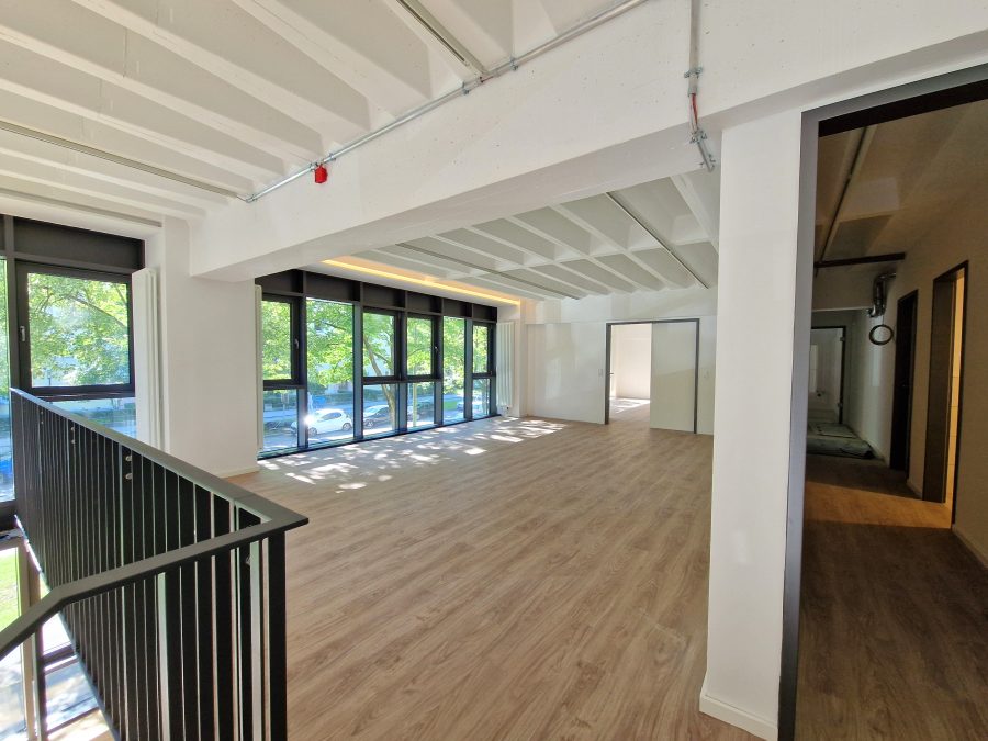 Die offene, zweigeschossige Architektur mit großen Fensterflächen zur Straßenseite bietet ein lichtdurchflutetes und repräsentatives Arbeitsumfeld – ideal für Unternehmen mit einem hohen Anspruch an Raum, Funktionalität und Design.