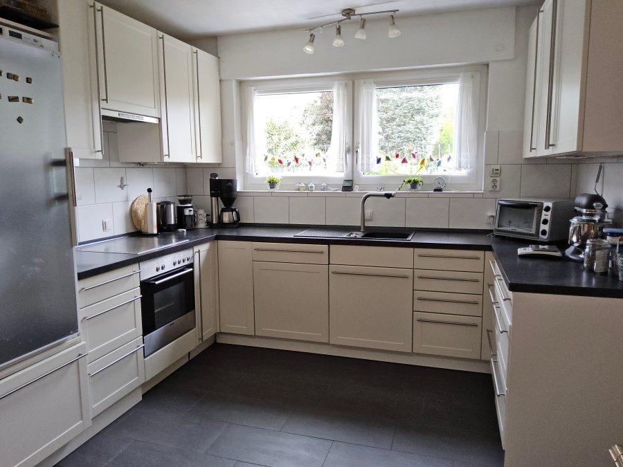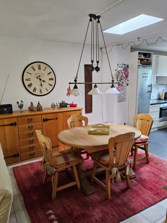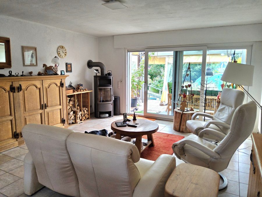 In der rechten Haushälfte findet man den großen, sehr hellen Wohn-/Essbereich mit angrenzender offener Küche. Das Highlight im Wohnbereich ist die große Schiebetüranlage mit direktem Zugang zur überdachten Terrasse (ca. 20 qm) und dem sehr schön angelegten, nach Westen ausgerichteten Garten. In der kälteren Jahreszeit sorgt im Wohnbereich ein effizienter Holzofen für eine wohlige Wärme.