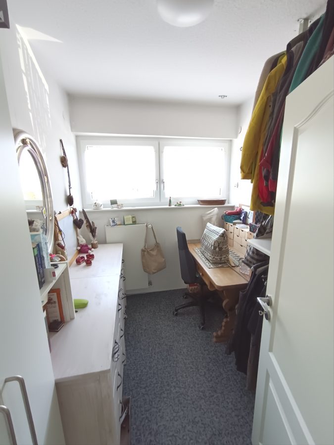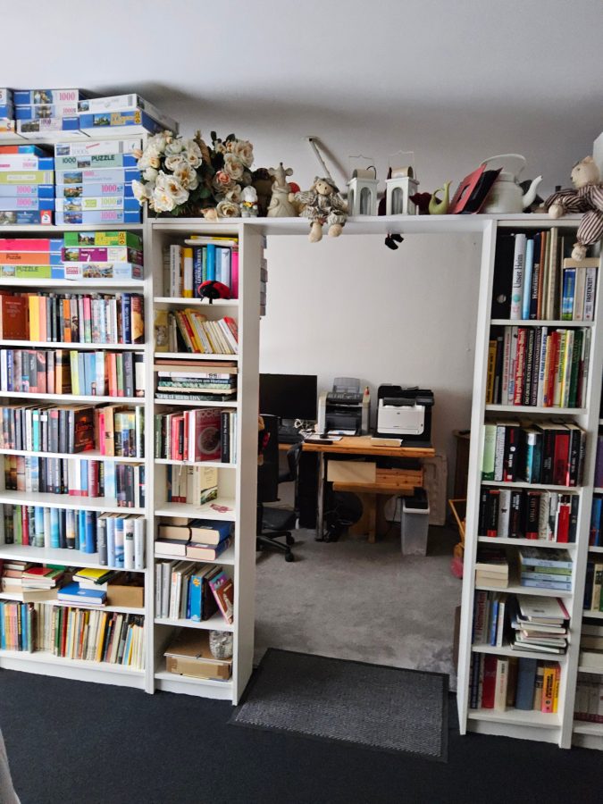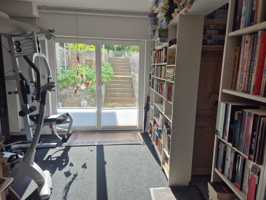 Der Wohntrakt befindet sich unter dem Schlafbereich im EG. Er bietet die Möglichkeit, großzügigen Wohnraum für ältere Kinder oder auch Generationenwohnen einzurichten. Der große Büro-/Hobbyraum (ca. 27 qm), wird zurzeit durch eine gestellte Bücherwand unterteilt, so dass zwei separate Bereiche vorhanden sind. Hier ließen sich durch eine Trockenbauwand zwei getrennte Räume (WZ und SZ) schaffen. Von dem größeren Bereich hat man die Möglichkeit durch eine große Doppelflügeltüre auf die eigene ca. 10 qm große Terrasse zu treten. Im kleineren Bereich ist ein großes Fenster verbaut.