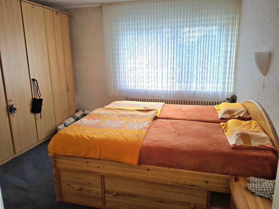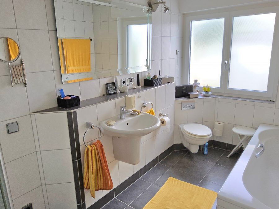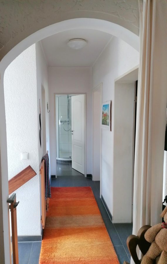 Von der Diele links abgehend, gelangt man in den Schlafbereich. Hier befinden sich das Elternschlafzimmer, ein großes Kinderzimmer, ein weiteres kleines Zimmer (Büro oder 2. Kinderzimmer) und das große modernisierte Bad mit Wanne und Dusche.