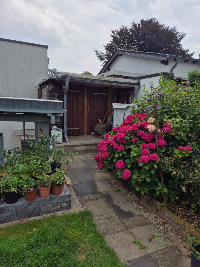 Der Gartenbereich und die Treppe zur unteren Terrasse wurden neu gestaltet. Hier ist ein kleiner überdachter Freisitz (z. B. für eine Outdoorküche), sowie mehrere Hochbeete entstanden. Diese werden momentan zum Anbau von Gemüse genutzt.