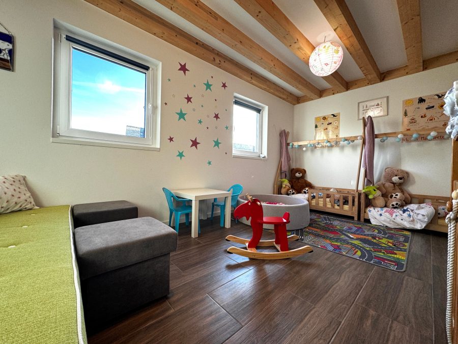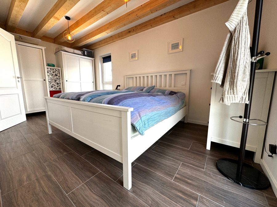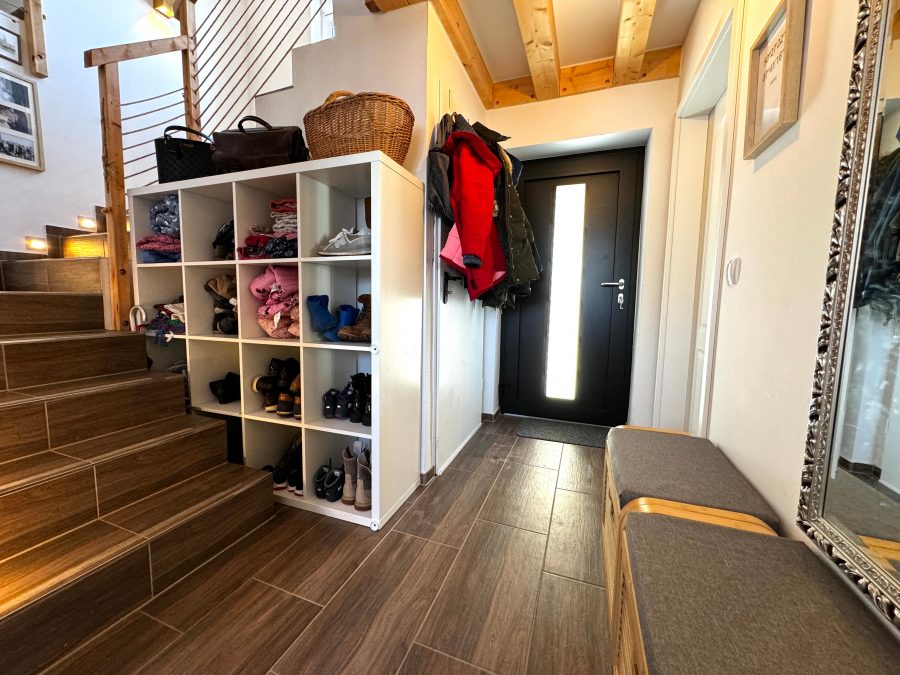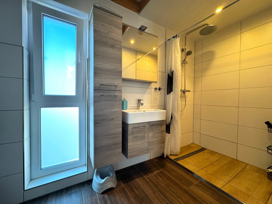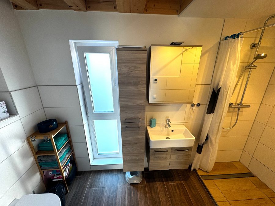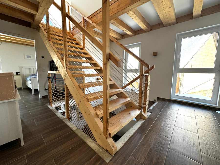 Obergeschoss: Im Obergeschoss finden Sie einen Flur, der zu den privaten Räumen führt. Ein komfortables Duschbad mit bodentiefer Dusche verspricht Entspannung und Erholung. Das Schlafzimmer und ein Kinderzimmer bieten Rückzugsorte für jedes Familienmitglied. Zusätzlich bietet ein praktischer Hauswirtschaftsraum Platz für organisatorische Bedürfnisse.