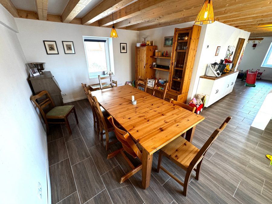 Erdgeschoss: Betritt man das Haus, wird man von einer einladenden Diele begrüßt. Neben einem Gäste-WC, bietet das Erdgeschoss einen offenen Wohn- und Essbereich. Dieser ist nahtlos mit einer modern ausgestatteten Küche verbunden, was das Herzstück des Hauses darstellt – perfekt für gesellige Abende oder entspannte Stunden im Familienkreis.