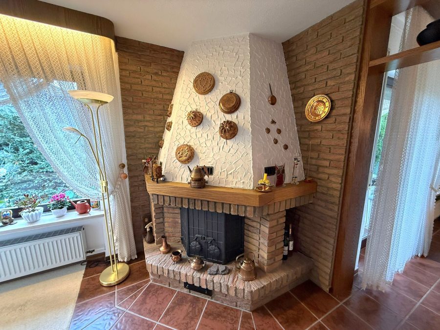 Das Erdgeschoss bildet das Herzstück des Hauses: Der großzügige Wohn- und Essbereich beeindruckt durch seine Offenheit und den charmanten Kamin, der an kühleren Tagen für eine behagliche Atmosphäre sorgt. Von hier aus gelangen Sie direkt auf die Terrasse und in den gepflegten Garten, der zu erholsamen Stunden im Freien einlädt. Eine separate Küche mit angrenzender Speisekammer, ein Schlafzimmer, ein Bad sowie eine großzügige Diele vervollständigen diese Etage – ideal für komfortables Wohnen auf einer Ebene.