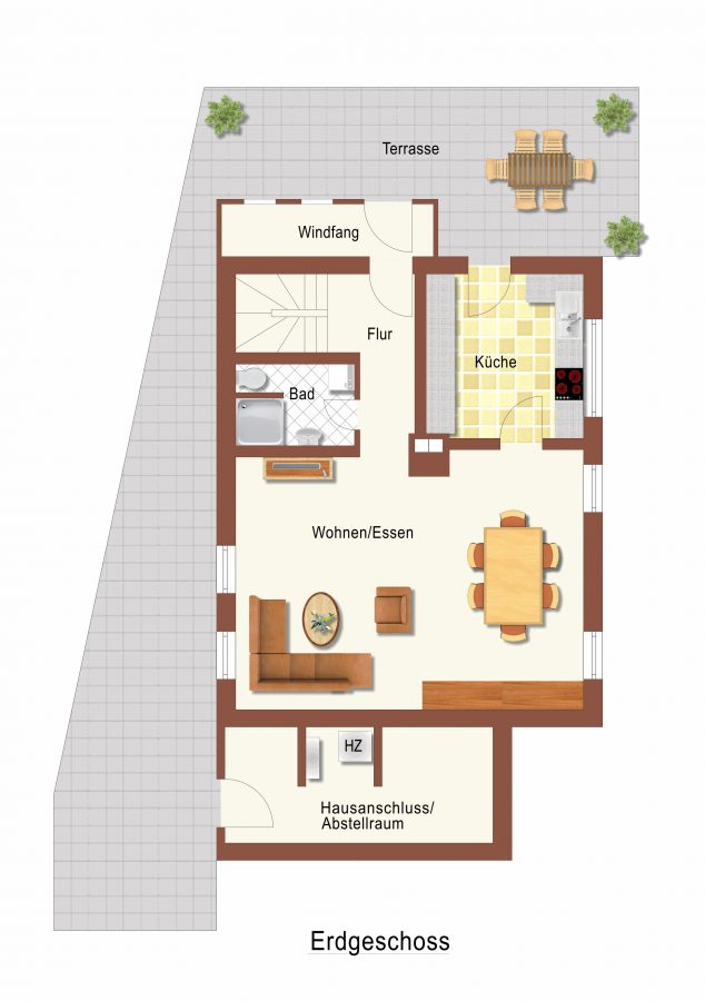 Erdgeschoss (ca.73m²): Diele, Treppenhaus, Bad, Wohn- Esszimmer, Küche mit Terasse und Garten, Heizungs- u. Technikraum