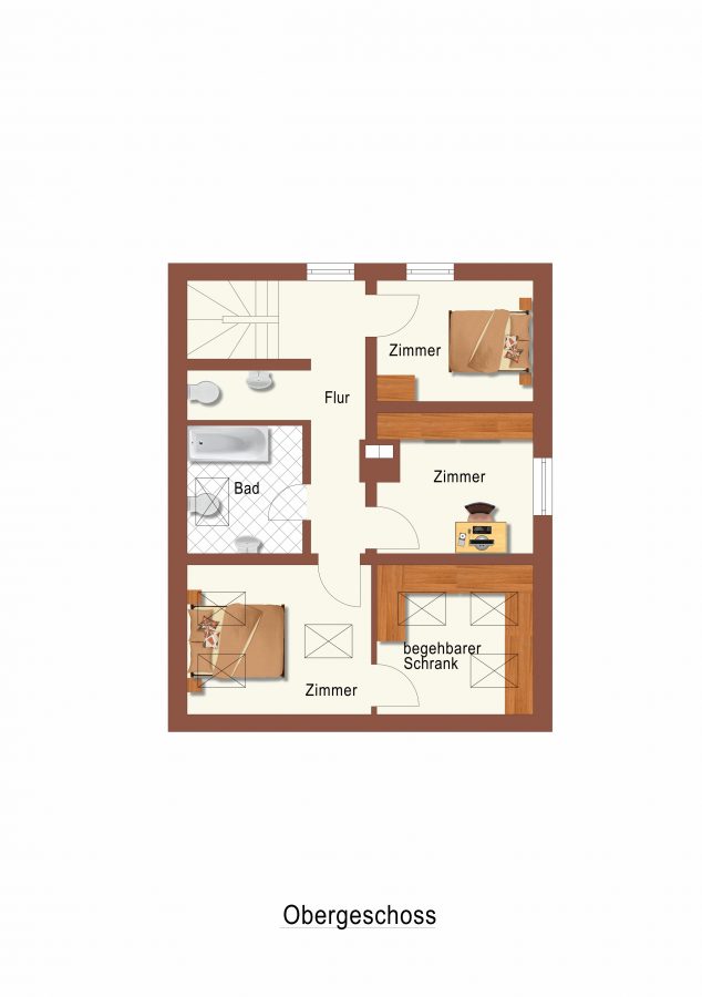 Im Obergeschoss erwarten Sie zwei Schlafzimmer, ein Badezimmer mit Badewanne, ein separates WC und ein großzügiges Hauptschlafzimmer mit Ankleidebereich und Empore.