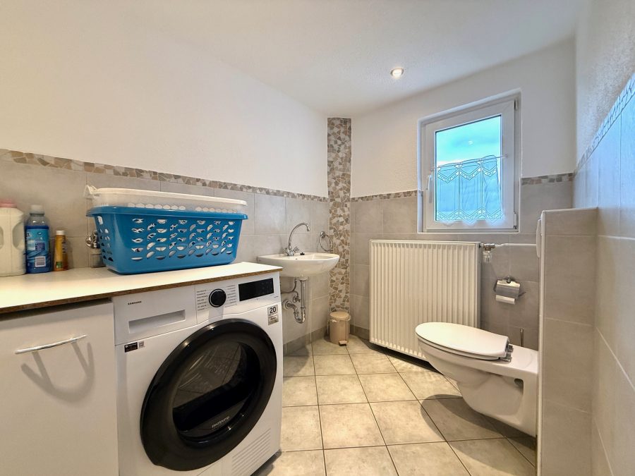 Das Obergeschoss überzeugt mit drei Schlafzimmern, einem großen Bad mit bodentiefer Dusche, Badewanne und Doppelwaschbecken sowie einem angrenzenden Hauswirtschaftsraum mit separaten WC. Ein Durchgangsraum bietet zudem die Option, eine zweite Küche einzurichten – perfekt für Mehrgenerationennutzung oder separate Wohnbereiche.
