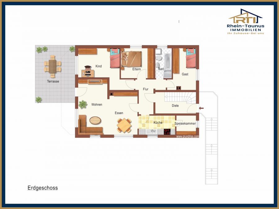 Wohnung Erdgeschoss (ca. 110m²): Flur, offenes Wohn- Esszimmer mit Küche und Vorratskammer, 3 Schlafzimmer, Badezimmer, Terrasse und Gartenzugang